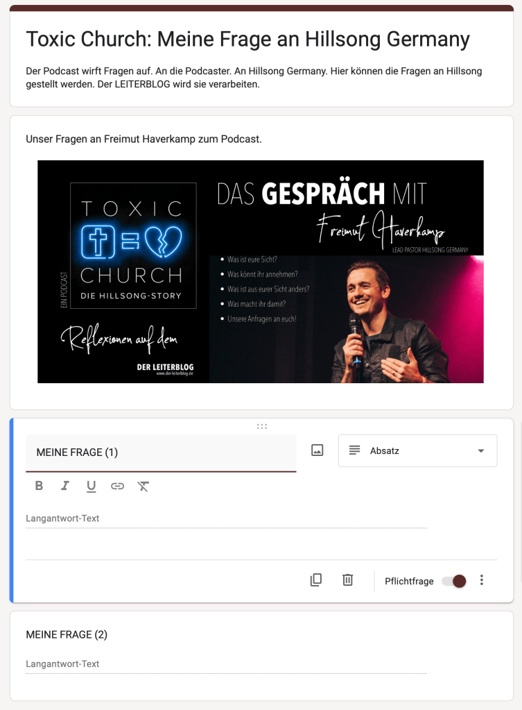 … können auch einfließen! Dazu hast du, lieber Leser, hier Möglichkeit, mir deine Fragen einzureichen. Ich werde sie bündeln und auch kritisch betrachten, weil über Fake-Accounts im Laufe der Reflexionen üble Reaktionen von Leuten kamen, die kein Interesse an den Fakten haben, sondern Hillsong anschuldigen wollen oder die Aussagen der Betroffenen auf respektlose Art in Frage stellen.
