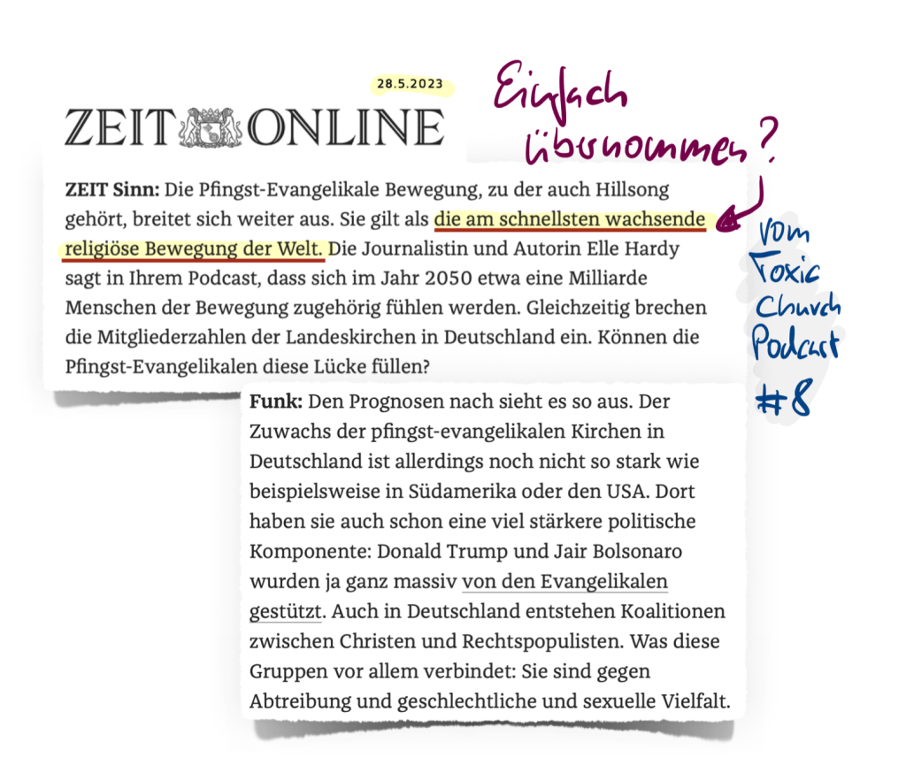 (Es heißt auch hier nicht „schnellstwachsende christliche Kirche, Gemeinschaft o.ä.“, was dann ja zutreffend wäre. Sondern Religionsgemeinschaft, wie im Podcast. Frau Funk korrigiert diese Aussage gegenüber Christ & Welt in der Zeit nicht. Es bleibt auch hier: „… die am schnellsten wachsende Religionsgemeinschaft der Welt.“)