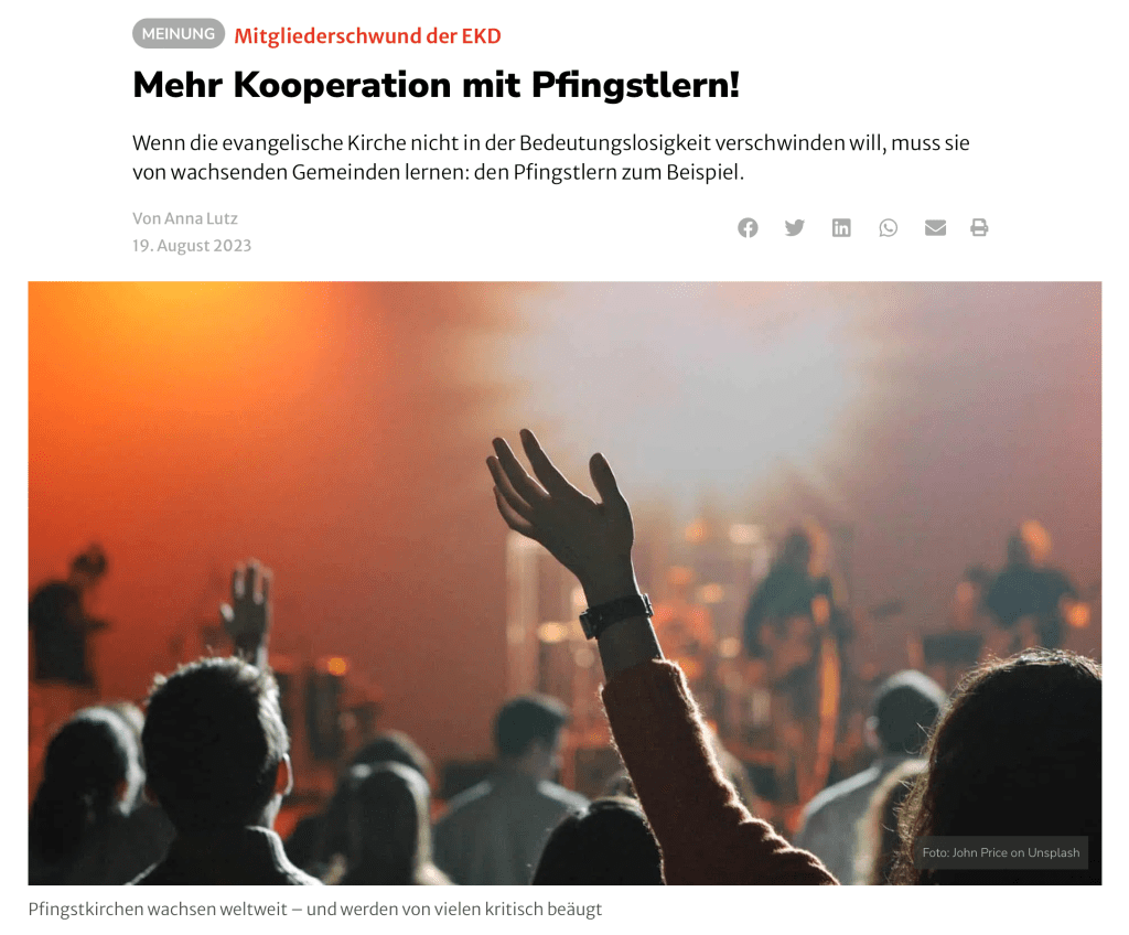 „Wenn die evangelische Kirche nicht in der Bedeutungslosigkeit verschwinden will, muss sie von wachsenden Gemeinden lernen: den Pfingstlern zum Beispiel.“ schreibt Anna Lutz in ihrem Kommentar, der im pro-Magazin nachgedruckt wurde.