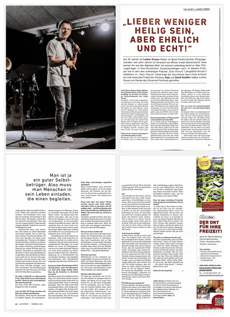 Anja und David Schäfer haben mich für das Magazin AUFATMEN interviewt. Es ging um die Vorwürfe des Podcast Toxic Church, um gute Selbstleitung und was man als Verantwortlicher tun kann, um die Langstrecke zu schaffen. Die Gefahren, selbst zu scheitern, falsch abzubiegen und irgendwann vor den Trümmern seiner Berufung zu stehen, sind nicht gering. Proben, Test gehören zum Weg der Nachfolge von Jesus. Auch als Führungskraft. Schon der Apostel Paulus mahnte:
