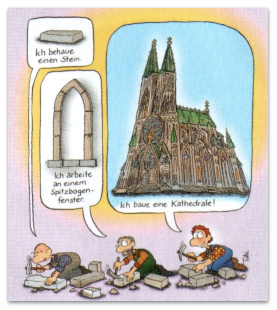 Die Priorität auf das zu legen, was wir bauen sollen, ist dagegen kraftvoll und wirksam! Die kleinen sinnvollen Einzelaktionen, Projekte, Prozesse … fügen sich in das große Bild und ergeben Sinn. Wie ein Mosaik aus vielen kleinen, unterschiedlichen Steinen besteht, so könnte das auch bei uns sein. Tolle Details, die aber erst im Gesamtbild ihre eigentliche Bedeutung entfalten. Deshalb ist diese grundlegende Frage, was wir bauen sollen, so kritisch!