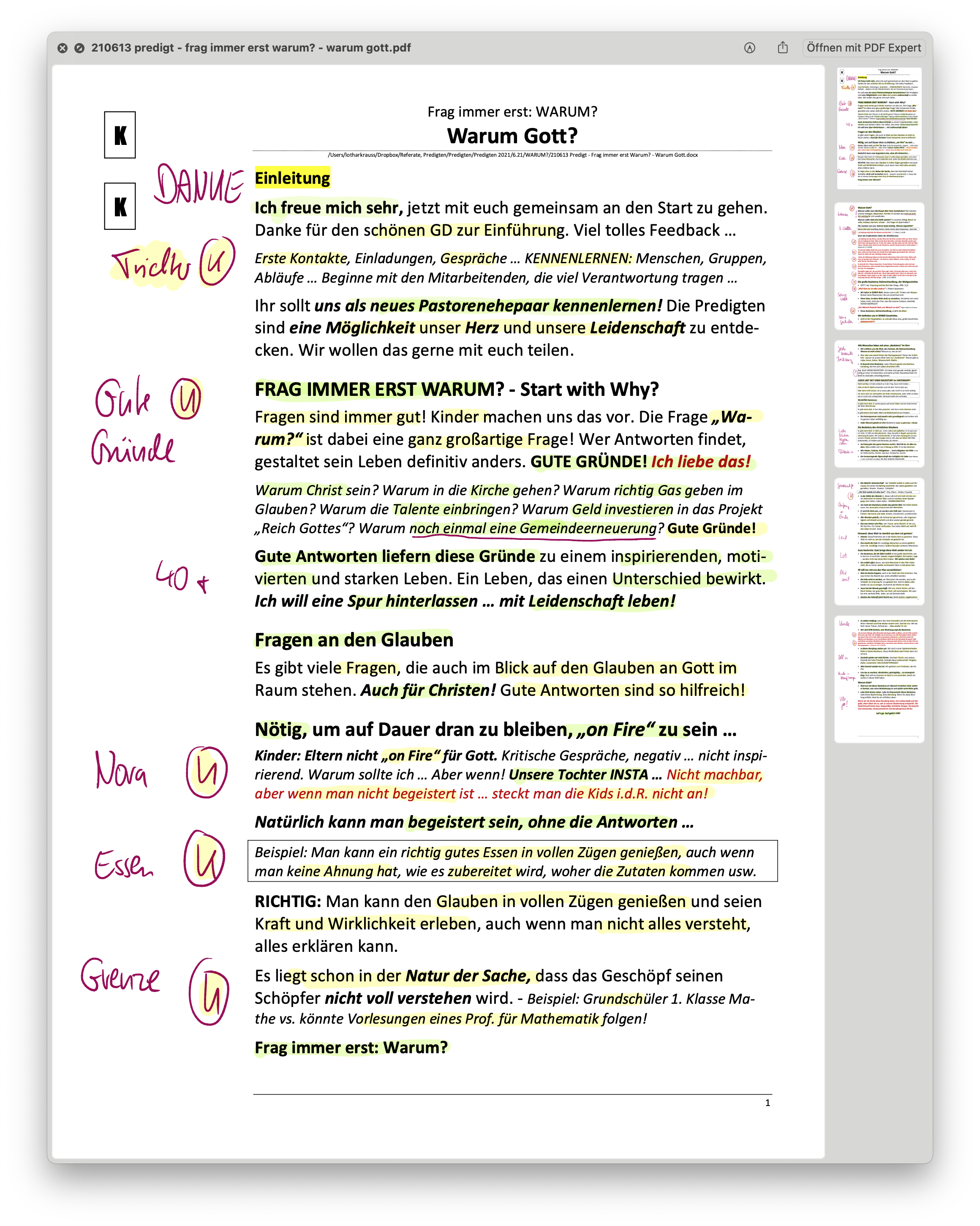 Gerade hatte ich ein paar freie Tage die ich nun dafür nutzte, diesem Wunsch nachzukommen. Ich verlinke hier die Originalkonzepte als PDF Dateien, mit denen ich selbst die Reihe 2021 gehalten habe. Mit meinen Notizen, Anmerkungen, Symbolen und Fehlern 😁. Hier ein Bildschirmfoto aus meinem ersten Konzept. Da könnt ihr sehen, wie ich meine Notizen für die Predigten mache. 🙈😁 Unten sind dann die einzelnen Themen genannt und direkt zum Konzept verlinkt.