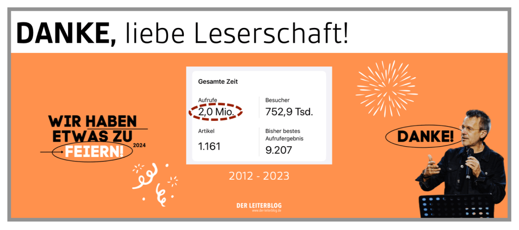 WordPress hat mich informiert, dass die 2 Mio Marke erreicht wurde. Im ersten Jahr verzeichnete der Blog 8.910 Zugriffe. Wenige kannten mich. Kein Netzwerk promotete mich. Und doch war da der Impuls es zu versuchen. Ein paar Ermutiger waren von Beginn an meiner Seite. Dr. Bernhard Olpen übernahm eine spielentscheidende Rolle, dass ich es tatsächlich wagte. Eine kleine Gruppe, mit der ich ein Leitungstraining in Esslingen durchführte, sorgte schließlich für den konkreten Startschuss. „Der Rest ist Geschichte …“