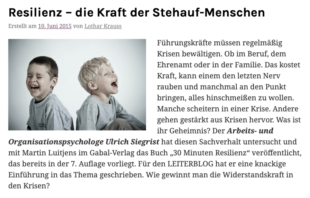 Prof. Dr. Ulrich Siegrist hat für den Leiterblog 2015 eine knackige Einführung in das Thema Resilienz geschrieben. Klicke auf das Bild. ☺️
