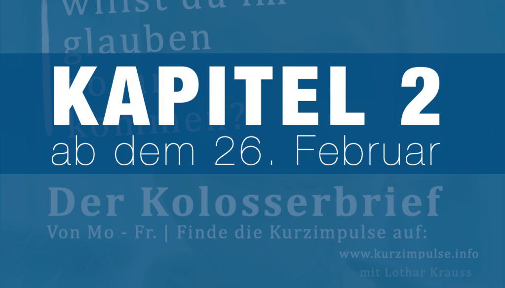 Seit Anfang Januar lese ich den Kolosserbrief und bespreche immer einen kleinen Abschnitt. Von Mo – Fr erscheint eine Episode im Podcast Kurzimpulse. Sie dauert ca. 6 Minuten. Meine Hörer sagen mir, dass sie die Episode jeweils im Bad hören, oder während sie das Frühstück richten. Andere nutzen sie als Einstieg in ihre eigene Beschäftigung mit biblischen Impulsen am Morgen. Oder auf der Fahrt zu Arbeit. Es gibt auch Hörer, die die ganze Woche in einem Rutsch hören. Etwa 30 Minuten sind dafür nötig. Eine kleine Bibelstunde, sozusagen 😊.