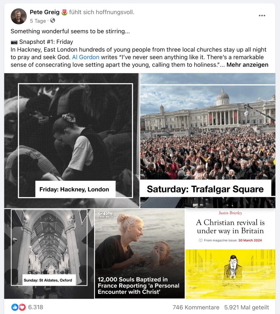 Ich hatte angekündigt, die Pause immer wieder einmal kurz zu unterbrechen, wenn ich ein spannendes Buch empfehlen oder von einer bemerkenswerte Entwicklung erfahre. Pete Greig, der Initiator des 24/7 Gebetes hat eine Wahrnehmung auf Facebook geteilt, die viel Resonanz bekommt und auch mich hoffnungsvoll anspricht.