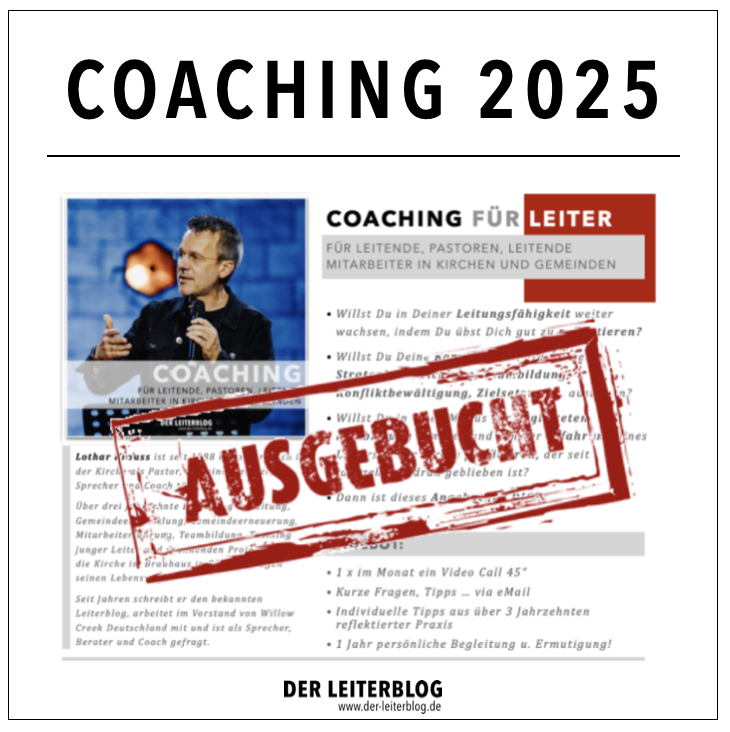 Für das nächste Jahr kann ich leider kein Angebot machen, da ich – mit meiner Frau 🔥 – für ein weiteres Jahr das Leitungsteam einer großen Organisation in Führungsfragen begleite. Das macht einfach so Sinn und gehört zur Seriosität der Tätigkeit, Prozesse zu einem Punkt zu begleiten. Darüber hinaus haben einige Coachees verlängert und die weitere Begleitung der Leitung einer Kirchengemeinde sowie die Verpflichtungen als Konferenz- u. Seminarsprecher haben mein Kontingent ganz aufgebraucht.