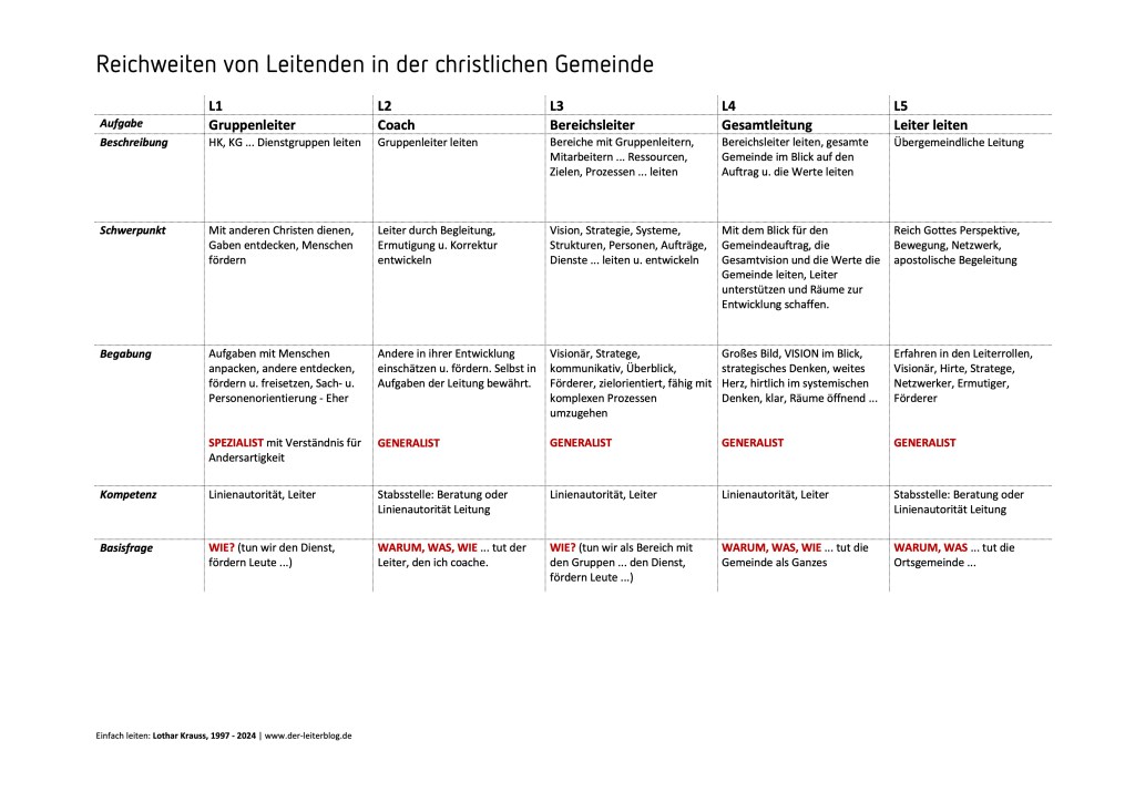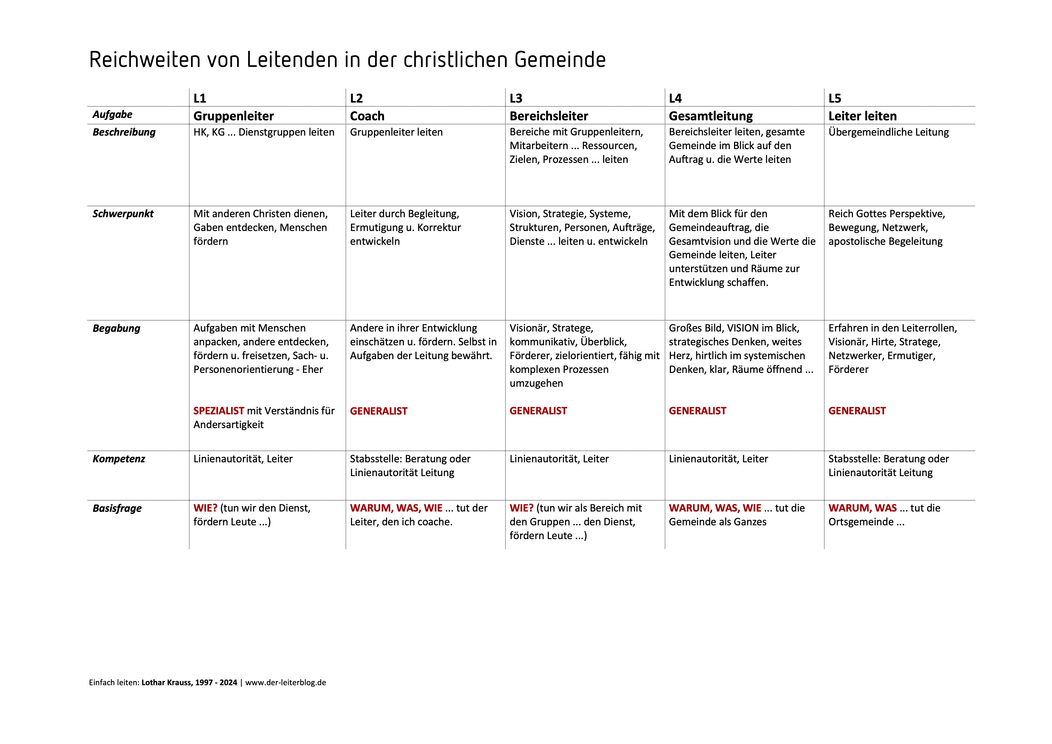 - L5: Dann Begleiter von außen für die Leitung. Klassisch, in den Denominationen, sind das Regionalleiter, Bundesdirektoren, Regionalbischöfe, Dekane … usw. In den letzten 15 – 20 Jahren sind es in bestimmten Freikirchen immer häufiger internationale Begleiter, Berater …