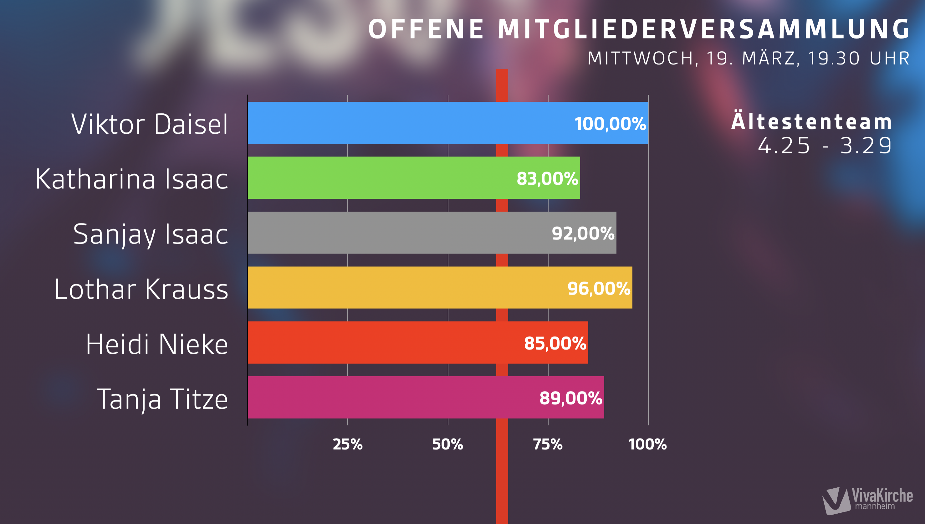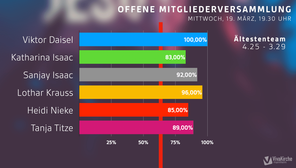Die Gemeindeerneuerung schreitet weiter voran. Mittlerweile sind sonntags durchschnittlich über 400 + Menschen in der VivaKirche. Noch viel mehr Leute besuchen im Laufe eines Monats die Church. Das neue Ältestenteam, bestehend aus sechs Personen, wird am 1. April offiziell seine Verantwortung übernehmen. Darüber hinaus besteht unser Lead Team aus neun Teil- und Vollzeitmitarbeitenden, die den Alltag, die Angebote und die Projekte der VivaFamily gestalten. Das Wachstum zeigt sich auch an vielen weitere Stellen. Aus 3 Hauskreisen sind 30 VivaGroups in 2,5 Jahren gewachsen.