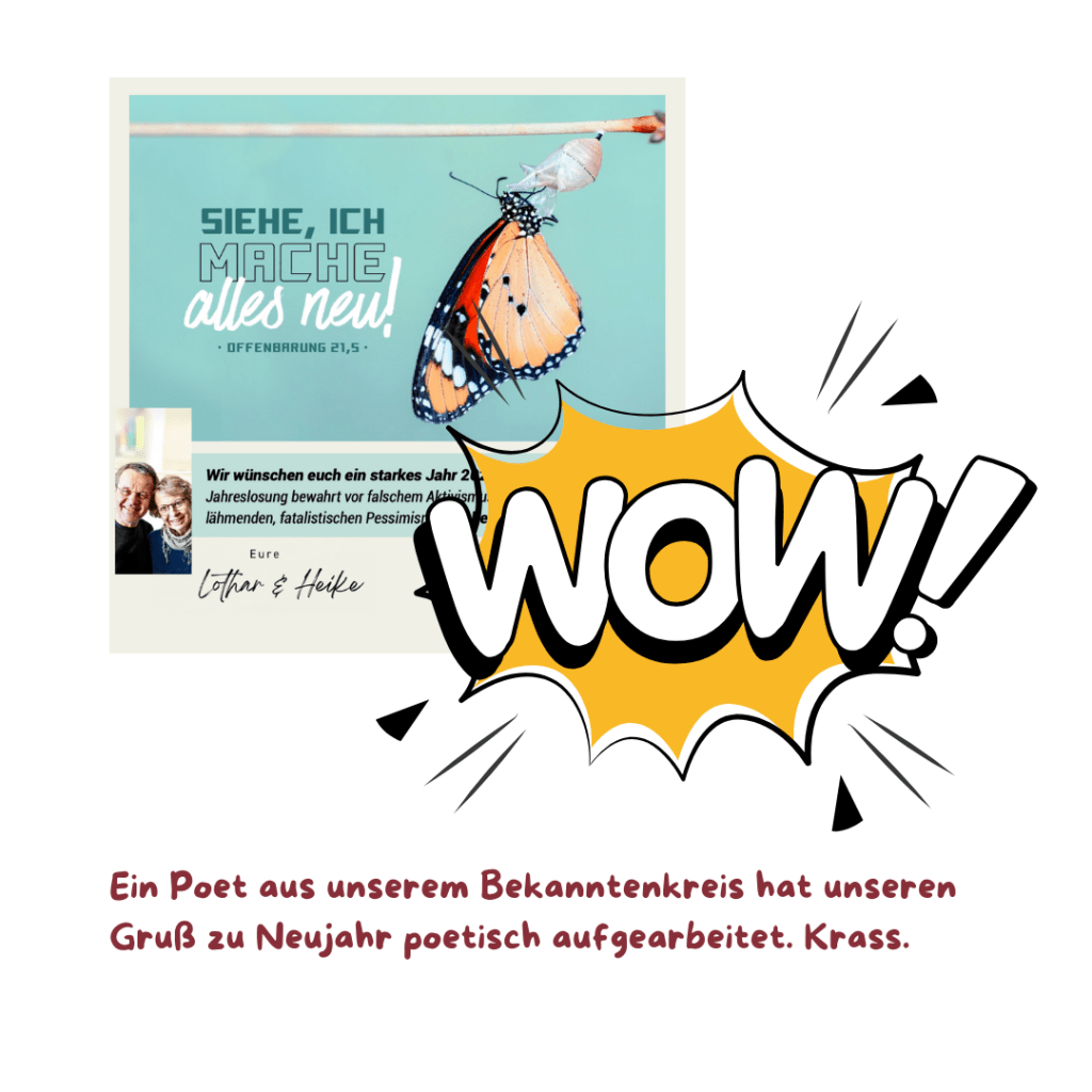 Genau das kann auch die Jahreslosung für uns tun. Für Heike und mich ist diese Perspektive in unserer aktuellen Situation besonders kostbar. Sie macht uns nicht passiv. Im Gegenteil: Wir gestalten, wir „schaffen Neues“ – im Wissen, dass alles Stückwerk bleibt, vorläufig und erneuerungsbedürftig.