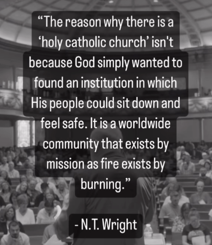 The reason why there is a ‚holy catholic church‘ isn’t because God simply wanted to found an institution in wihich His people colud sit down and feel safe. It ist a worldwide community that exists by mission as fire exists by burning. N.T. Wright