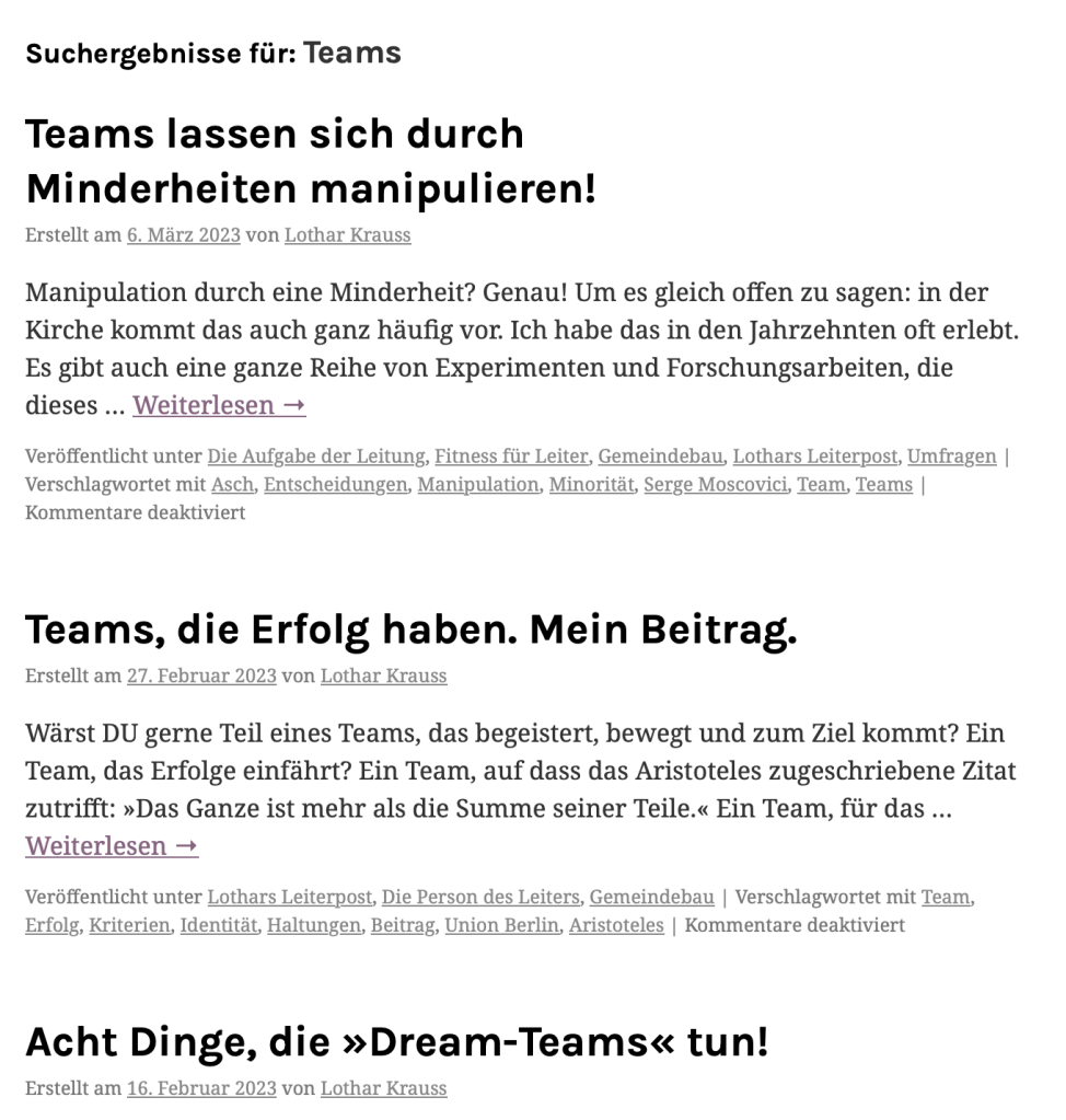 Teams zu bauen ist eine der zentralen Aufgaben einer Führungskraft. Leitungskreise sollten keine “Interessenvertretungen” von Bereichen und Themen der Gemeinde (Firmen, Organisationen) sein, sondern dynamische Zusammenschlüsse von Leuten, die zusammen EIN Ziel mit Vertrauen, Begeisterung, Absicht und Überlegung strategisch und zielgerichtet ansteuern.